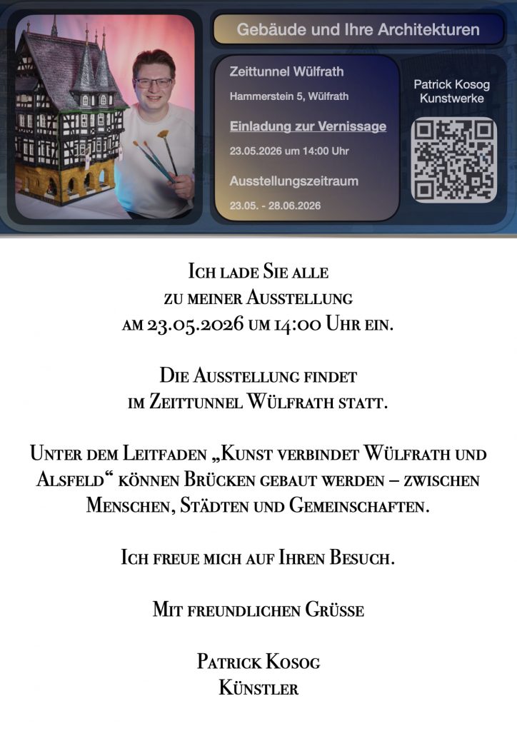 Die Vernissage findet am Samstag den 23.05.2026 um 14:00 Uhr statt.